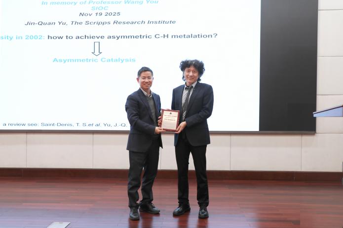 2025年11月19日,美国艺术与科学院院士、美国斯克利普斯研究所余金权教授应邀访问中国科学院上海有机化学研究所,并作题为“Enantioselective C-H Activation with Bifunctional Ligands:From Curiosity to Industrialization”的汪猷科学讲座。讲座由上海有机所所长胡金波研究员主持,游书力院士为余金权教授颁发了荣誉奖牌。来自上海有机所及周边科研院所、高校的400余名师生到场听讲。