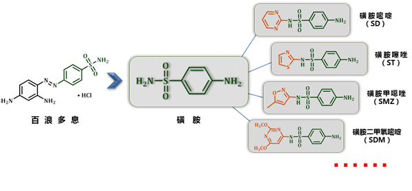 合成化学是新药发现的主要动力和药物制造工业技术进步的源头。20世纪是人类社会发生深刻变化的世纪,在过去的100多年中,特别是20世纪50年代以后,人类的平均寿命和健康水平得到了空前的提高。这一巨大进步很大程度上归功于合成药物的发展,其中最为重要的当属抗菌剂和抗生素的开发。上世纪初,由病原微生物引起的炎症和传染病是人类健康的巨大威胁,当时医生对于流行脑膜炎、肺炎、败血症等这些现在已经十分普通的症状束手无策,甚至人们可能仅仅因一次感染而死亡。19世纪后半叶,在珀金(W. H. Perkin)合成的苯胺类染料的基础上,德国细菌学家郭霍(H. H. R. Koch)尝试用这些染料对细菌进行染色,成功创建了细菌染色法,大大促进了微生物学的发展。同时,科学家在用染料对细菌进行染色的试验过程中,观察到某些合成染料有一定的杀菌作用,1932年,德国I.G.染料工业研究所病理学主任杜马克(G. J. P. Domagk)在试验过程中发现,一种被称为“百浪多息”(Prontosil)的红色的偶氮类染料对于感染溶血性链球菌的小白鼠以及兔、狗等都具有很好的疗效,并以此染料挽救了身患链球菌败血病的女儿,一个人工合成抗感染疾病化学治疗药物的新纪元由此开启。科学家通过对这一药物作用机理的进一步研究发现,百浪多息的杀菌作用实际上是由于其在体内发生降解所生成的产物4—氨基苯磺酰胺(也就是我们熟知的“磺胺”)产生的,从而诞生了磺胺类药物,并挽救了无数人的生命,杜马克也因此获得了1939年的诺贝尔生理学或医学奖。在磺胺的启发下,化学家们又合成了无数的磺胺类似物,并通过研究磺胺类药物的化学结构和抑菌作用的关系,从中寻找更为强效、更为广谱的抗菌剂,现在已经有20多种磺胺类的药物在市场上销售(图1)。