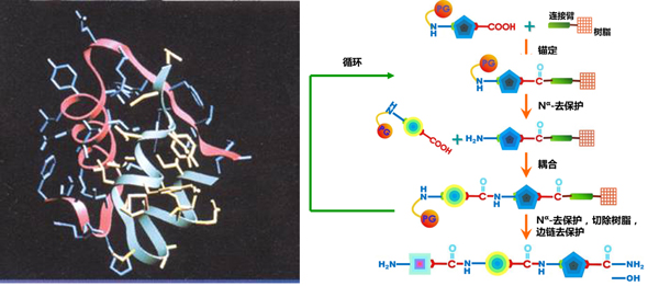 图2. 从人工全合成牛胰岛素到固相多肽合成技术的发明—合成化学促进了生命科学的发展