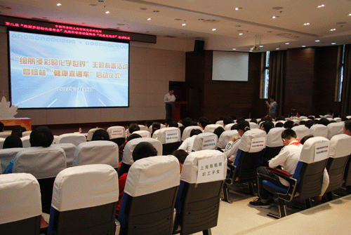 5月18日,以“绚丽多彩的化学世界”为主题的2013年度上海有机所公众科学日科普活动暨枫林科技周开幕式在中国科学院上海有机化学研究所君谋楼举行。徐汇区副区长王珏、徐汇区体育局局长金伟红、枫林街道办事处主任黄立波、副主任刘艺、徐汇区科委、科协副主任宋开成、徐汇区教育局副局长沈韬,上海市零陵中学副校长张孜燕,上海有机所戴立信院士、上海分院交叉学科中心副主任章文峻、上海有机所党委书记郏静芳、副所长马大为、唐勇、俞飚等有关领导,以及上海零陵中学师生和枫林社区居民等共200余人参加了本次活动。