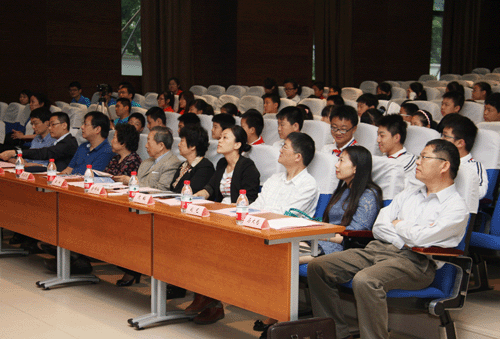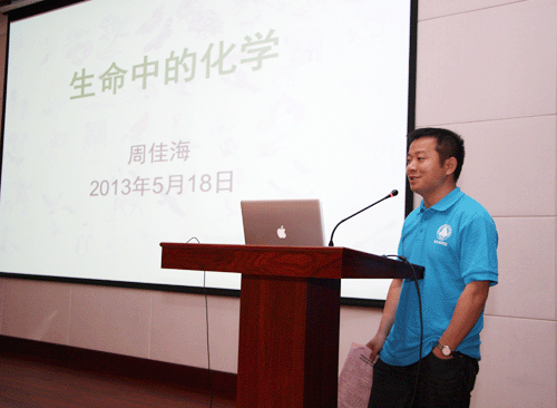 上海有机所周佳海研究员为本次活动精心准备了科普报告。周佳海以《生命中的化学》为题做了专题报告,生动介绍了维生素、食品添加激素等对人类身体健康的作用和危害,并深入浅出地讲解了血型遗传模式,H7N9禽流感病毒的特征、感染途径、检测与防治,周佳海向同学们简单介绍了针对流感病毒的药物设计和合成思路。在认真聆听报告后,同学们争相与主讲人进行了问答互动,场面十分热烈。现场部分同学们还亲身体验了使用三聚氰胺检测试剂盒检测牛奶等食品中是否含有三聚氰胺的小测试。