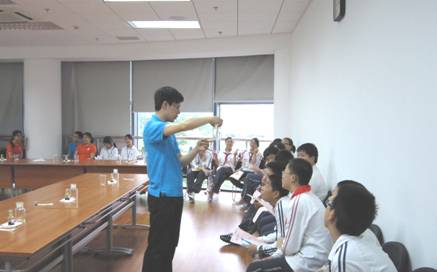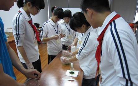 在中国科学院天然产物有机化学重点实验室的展厅内,志愿者向参观的同学们通过幻灯片展示了菠菜叶子中色素分离的趣味小实验。并亲自示范了操作:将绿色的菠菜叶子放到研钵中,加入适量石英砂和乙酸乙酯有机溶剂,将叶子研磨成碎屑,其中的色素就从叶子细胞中被溶解于溶剂中,将溶剂转移到试剂瓶中,用棉签蘸取溶液涂在事先准备好的在距长条滤纸的一端约1cm处,晾干后将其一端浸入到配好的展开剂中,一段时间后,可以看到滤纸条上出现四条不同的色带。有趣的实验吸引了同学们极大的兴趣和热情,同学们在志愿者的指导和帮助下积极动手,亲自操作,有的研磨叶子,有的将萃取出来的溶液涂抹在滤纸上,放入展开剂中,一段时间后大家都看到了自己的滤纸上出现了清晰的四条色带,志愿者向同学们分别解释每条色带都是什么色素,并引申说,就是因为这些不同的色素,所以植物的叶子才会随着季节的变化显示出不同的颜色。同学们提出了许多自己感兴趣的问题,得到了志愿者们通俗、细致的回答,很大程度上提高他们学习化学的积极性。