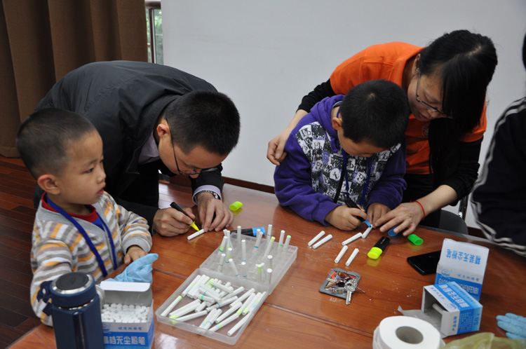 另外,金属室的研究生志愿者们为来访的参观者精心准备了十个非常有趣的化学小实验:颜色分离、酸碱心里美、喷雾作画、水中花园、星光飞舞、谁灭了蜡烛、颜色秋千、彩色温度计、隐形墨水、可乐变雪碧。实验中化学反应产生的颜色和物质形态的变化等引起了参观者强烈的好奇心,他们兴趣盎然、热情高涨,在志愿者的帮助下积极动手参与,并提出了感兴趣的问题,得到了志愿者们耐性细致地回答,同时在志愿者的专业指导下,他们还很认真地亲自操作,一个个有趣的实验让参观者们充分领略到了化学的神奇与美好。在颜色分离的过程中,他们领会了颜色的奥秘;在体会酸碱心里美的同时,他们发现了酸碱的奇妙;在喷雾作画时,他们创造和书写了许多美妙的画作和书法作品;在“游览”水中花园时,他们亲眼目睹了科学的神奇;在星光飞舞的实验台前,他们领略了亲手制作漫天“星光”的快乐;在体验颜色秋千的过程中,他们享受到了化学实验的创造性和乐趣;在进行谁灭了蜡烛的实验过程中,他们理解和学习到了蜡烛熄灭的奥秘和其中蕴藏的化学原理;在制作彩色温度计、隐形墨水以及可乐变雪碧的过程中,他们观察到了令人惊喜地变化,禁不住发出阵阵欢笑声。展厅内气氛活跃而热烈,参观者们踊跃提问,积极参与,志愿者们耐心讲解,规范演示,实现了良好的互动。