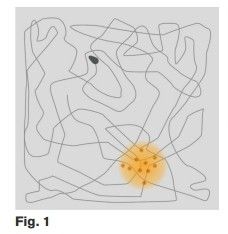 莫瑟尔夫妇(May-Britt 和Edvard Moser)更进一步,他们在临近海马体的大脑另一个名叫“内嗅皮层”的区域有了意外发现。他们注意到,当小鼠经过排列为六边形的多个地点时,其大脑中的部分神经细胞发生激活(图2)。这些细胞都会对特定的空间模式做出反应,它们整体上构成所谓“网格细胞”。这些细胞组成一个坐标系统,从而让空间导航成为可能。内嗅皮层区域的其他细胞能够判断自身头部对准的方向以及房间的边界位置,这些细胞都与位于海马体内的位置细胞相互协调,构成一条完整的回路。这一回路系统构成了一个复杂而精细的定位体系,它是我们大脑的“内置GPS”(图3)。