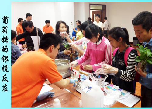 中国科学院上海有机化学研究所于2015年5月16日举办了第四届“绚丽多彩的化学世界”主题科普公开日活动。此次活动接待了来自零陵中学、西南模范中学、建襄小学、盛大花园小学、向阳小学、徐汇实验小学等上海地区中小学的同学及家长约600余人。位于在有机所君谋楼第二教室的中国科学院天然产物有机合成化学重点实验室开放展厅里,来自重点实验室各课题组的志愿者们为参观者精心安排了8个精彩的科普小实验:葡萄糖的银镜反应、魔壶实验、蓝瓶子实验、泡泡火山、鸡蛋入瓶、把彩虹搬到屋里来、流血的金属球及红玫瑰蓝玫瑰。