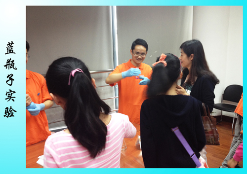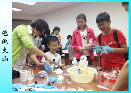 林国强课题组展示了“泡泡火山实验”。志愿者将配好的双氧水、洗洁精的水溶液和颜料加入塑料瓶中,然后加入碘化钾水溶液,瓶子里就发生了反应,彩色的泡沫就源源不断的从瓶口溢出来,有趣的现象吸引了小朋友的围观。
