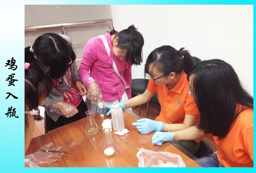 田伟生课题组展示了“鸡蛋入瓶实验”,该实验向小朋友们展示了两个有趣的自然现象。当我们用打火机点燃沾过酒精的棉花,投入瓶内,再将比瓶口大的去壳的熟鸡蛋置于锥形瓶口时,瓶里燃烧消耗的氧气得不到补充,于是瓶中就产生了负压,鸡蛋就自己跑到瓶子里去了。 当把瓶口倒过来,用电吹风加热瓶底时,鸡蛋又会自己出来。