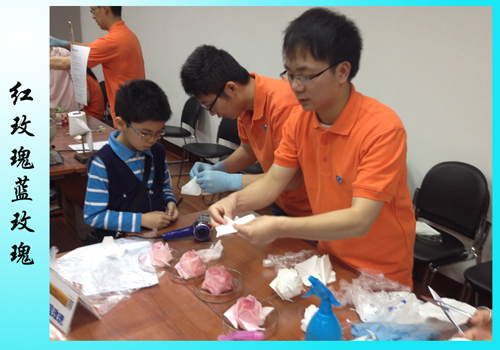 李超忠课题组展示了红玫瑰蓝玫瑰实验。将滤纸折成玫瑰花状,用铁丝固定,把氯化钴配成的溶液,装入喷雾器中,将溶液喷到纸花上则变成玫瑰色。用电吹风缓缓吹干,可以看到玫瑰花由粉红变成紫红,再变成蓝紫色,最后变成蓝色的过程。再往蓝色的玫瑰花喷水则又变成粉红色。