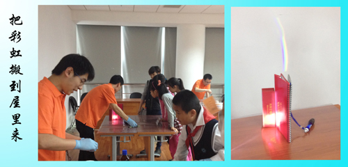 洪然课题组给大家带来了两个趣味实验。把彩虹搬到屋里来利用三棱镜旋转使原来的自然光折射出七色光投映在白色墙壁上。流血的金属球,用金属钠和水反应生成的氢氧化钠使酚酞溶液变红。