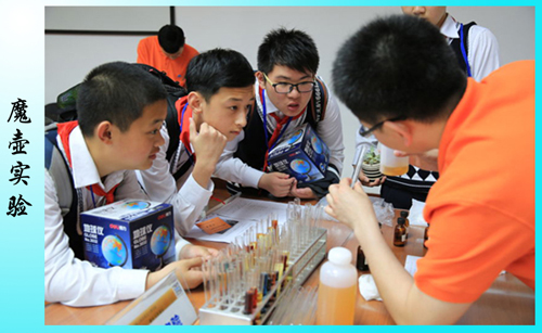 姜标课题组展示了魔壶实验,其基本原理是氯化铁与不同试剂的反应。虽然具体的原理小朋友们目前还难以理解,但是通过实验中多彩的颜色变化,让小朋友们看到了化学的神奇,从其聚精会神的表情就可以看出。