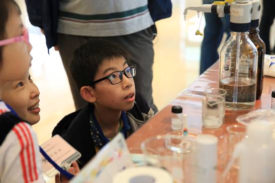 “摇一摇就变色”和“蓝瓶实验”实验桌前也吸引了众多的小朋友,大家都对颜色的动态变化过程投来了好奇的眼光。小朋友们均争先恐后、兴致勃勃的参与到实验中来,认真的倾听志愿者的讲解,在娱乐中学习了精彩实验背后的实验原理。