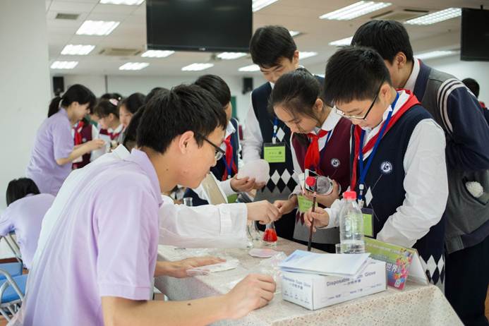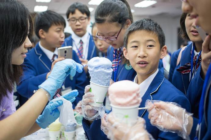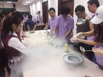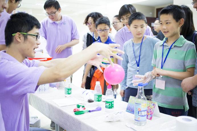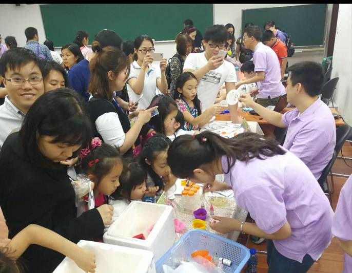 科普专题讲座结束后,同学们在志愿者的引导下参观了个6个趣味实验展厅,展厅里呈现一如既往的火爆,上下午迎来了超过1000位的社会公众。100多位志愿者准备了60多个化学实验,液氮冰淇淋,泡泡火山,彩色鸡尾酒,酷炫风暴瓶……这些实验现象明显,要么颜色变化,要么形态变化,但总是给予参与活动的孩子们意想不到的结果,加上志愿者们耐心到位的讲解,孩子们无不感叹化学的神秘和奇妙,在摊位前久久不愿离去!在活动即将结束时,不少孩子们才开始意识到他们才玩了不到三分之一的趣味实验,这时候的他们一边遗憾地望着忙碌收拾的志愿者,一边喃喃自语:我明年一定还要来……