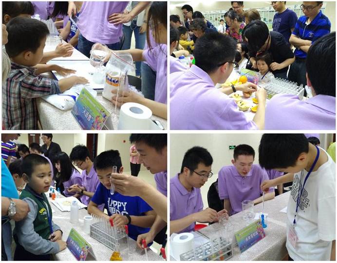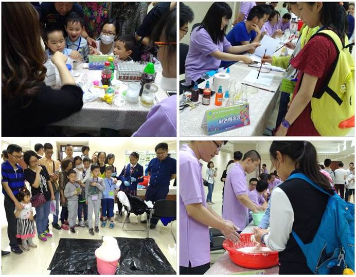 为了让大家更直观的体会到化学的奇妙之处,志愿者们准备了9个妙趣横生的化学小实验:1、“牙膏中的氟元素”实验阐明牙膏中氟元素的作用以及过多时的危害。2、“大象牙膏”实验因其产生的现象像一个巨大的牙膏,很像大象采用的牙膏,故被实验者称为 “大象牙膏”热闹的“泡沫大爆炸”吸引了不少小朋友的目光。3、“彩色鸡毛信”实验用毛笔分别蘸取甲基橙试剂、石蕊试剂、酚酞试剂,在白纸上绘画、写字告诉同学们酸碱的变色效果。4、“人造雪”实验的材料是一种神奇的吸水树脂,能把水变成一种白色蓬松的物质,看起来像真雪一样。这种雪现常用在电影业及室内装饰上(如圣诞节的装饰)。5、“液体变软胶”实验是聚乙烯醇溶液与硼砂水溶液混合后,将产生硼酸和聚乙烯醇的钠盐,从而产生凝胶化,最后变成软胶,可随意变形。6、“吹气球”实验通过小苏打和白醋混合,快速产生二氧化碳从而把气球吹大,引来了喜欢气球的同学。7、“水果电池”实验让小朋友们学到些化学和物理知识。8、“爱吹泡泡的C02” 告诉小朋友干冰是固态的二氧化碳遇水容易气化,形成了二氧化碳气体便能把肥皂泡吹起来。9、“坚固的液体”实验将水与淀粉按质量比约1:1缓慢混匀,形成非牛顿流体。此液体在快速击打下刀枪不入,在手中挤压形成固体面团,缓慢轻柔触碰则为均匀的液体形态。多个实验多次补充实验原料后,很多同学们仍然是意犹未尽。9个小实验中具有氟化学特色实验,又有大家可以亲自操作的实验,让参观者真正感受化学的美妙。展厅内气氛活跃热烈,参观者乐于询问,在满足他们的好奇心时,志愿者们以通俗的语言讲解其中的原因,增加他们对化学的兴趣,实现了良好的互动。