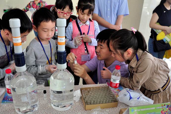 “风暴瓶”是款很有人气的装饰品,在发明之初被用来预测天气。在志愿者的指导下,小朋友们将自制的“风暴瓶”放入冷水和热水中观察瓶内结晶的变化。由于溶液内的樟脑在乙醇内的溶解度会随着温度变化,而硝酸钾、氯化铵控制在晶体高速生长过程中的连续成核。当放入热水时,溶液变得澄清;放入冷水时,樟脑析出溶液变得浑浊。“变水成冰”利用了过饱和溶液加入溶质晶体后会迅速结晶的性质;“会变色的水”利用了将碘盐氧化或碘还原后与淀粉溶液产生显色或褪色的现象。各种神奇的现象引起小朋友的阵阵惊呼,很多小朋友将自制的“风暴瓶”和“会变色的水”带回了家,继续进行观察。