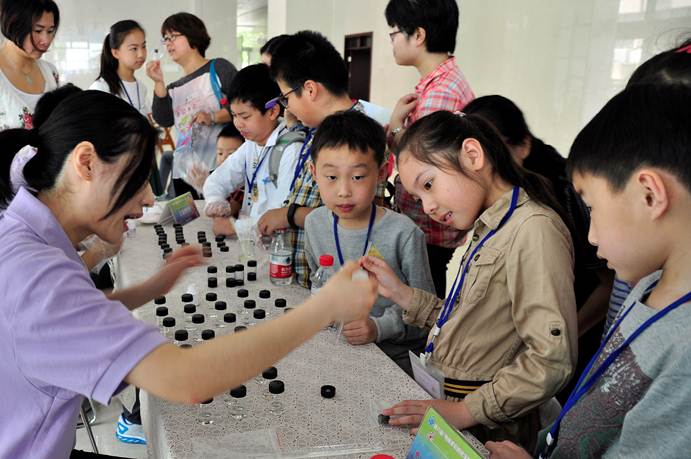 5月20日“绚丽多彩的化学世界”科普公开日活动在有机所拉开帷幕。有机所公共技术服务中心和姚建华课题组的志愿者们在有机所君谋楼一楼大厅向前来参观的小朋友们和他们的家长进行了趣味实验的展示。