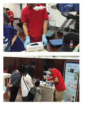 恰恰与这两个实验相反的,妙手执壶则是志愿者别出心裁的一场魔法秀,让大家感受到化学反应呈现出的肉眼可见之色彩。茶水中茶多酚和铁离子络合后变为黑色,在悄悄带入草酸水溶液后黑色褪去。一个小小的障眼法加上“说书人”的精彩解读,小朋友们一阵阵惊喜哗然。看似平淡无奇的“洗大白”维C之奥秘其实也不那么不简单,吸引了很多人家长的驻足、聆听和询问。志愿者透过米粒遇到碘单质变色、经维C溶液洗涤可复原实验现象,解释了维生素C是为人体健康之必需。志愿者们更是颇有耐心地和小朋友们科普了维生素C在新鲜瓜果蔬菜中的含量,使得小朋友和家长们从科学的角度了解了平日里多吃瓜果蔬菜的重要性。