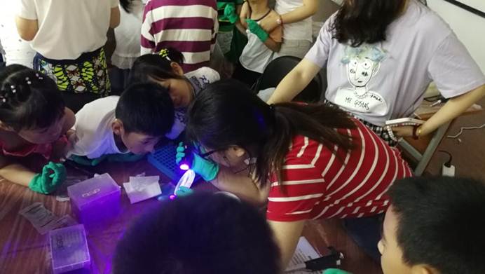 最后,两位科普志愿者通过琼脂糖凝胶电泳检测了同学们质粒抽提的结果,都获得了较高浓度的DNA,实验也就到此结束啦。本次课程通过有趣的故事,深入浅出的给同学们简要介绍了基因的相关知识,并亲自动手体验了科学实验,同学们都感觉获益匪浅。