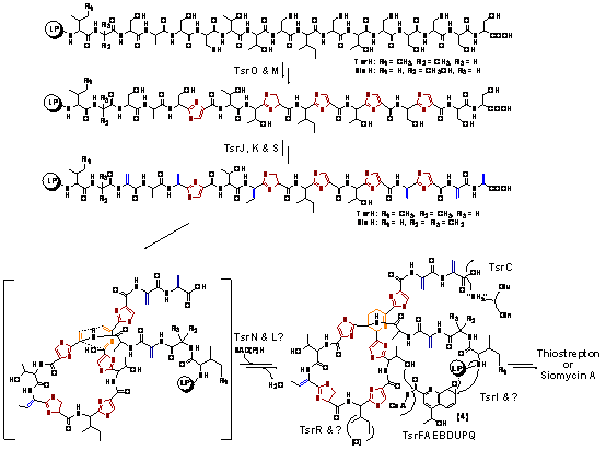 硫肽类抗生素是一类来源于微生物,富含元素硫、结构被高度修饰的聚肽类天然产物,这一庞大的“家族”至今已发现了超过80个以上的成员。尽管存在整体结构的差异,但所有的成员都具有一个以吡啶或哌啶为核心、由多个5元杂环和脱水氨基酸所组成的环肽中心。大多数硫肽类抗生素具有良好的抗菌活性,其中部分成员对多种耐药性的条件致病菌具有极强的杀伤效果,在细菌耐药性日益泛滥的今天,引起了医药界对于这一古老抗生素家族的重新关注。 自1948年微球菌素首次被发现以来,硫肽类抗生素复杂而独特的化学结构吸引了众多合成化学家的目光,目前已有多个成员的全合成研究被报道;然而,关于其生物合成的途径却一直是个谜:微生物采用什么样的方式产生如此复杂的天然产物呢?一种较为普遍的观点认为,硫肽类抗生素的肽链骨架是由非核糖体依赖聚肽合成酶所聚合,因为这种方式更能符合高度修饰的骨架特征。 经过近6年的努力,中国科学院上海有机化学研究所刘文课题组的科研人员破解了这一谜团:通过最为典型的硫链丝菌素及其类似物盐屋霉素A的比较研究,发现硫肽类抗生素起源于一条核糖体编码的前体肽,经过包括环化脱水/脱氢形成噻唑/咪唑环、脱水形成脱水氨基酸以及【4 + 2】环合反应等后修饰步骤构建了这一家族化合物所共有的特征性结构(Liao, R. et al. Chem. & Biol. 2009, 16, 141)。 这一生物合成的共同性体现在遗传上的保守性。根据这一特点,研究人员通过基因组扫描的方法,发现了多个微生物具有产生新型硫肽类抗生素的潜力,并在结构解析的基础上验证了一株芽孢杆菌产生的微球菌素。而这株菌株自发现和保藏以来,从未发现过具有产生硫肽类抗生素的能力。 相对于化学合成,硫肽类抗生素的生物合成途径显得相当高效而简洁。基于核糖体依赖的前体肽形成天然产物的例子已有很多,但如此丰富的后修饰过程还没有报道过,这就为采用组合生物合成的方法,即前体肽的突变和后修饰步骤的组合来扩展化合物结构的多样性创造了契机。此外,生物合成遗传特征和结构特征对应的保守型也为后基因组时代新型硫肽类抗生素的发现提供了条件。这一研究对于发展新型硫肽类抗生素药物具有重要的意义。 他们的文章发表以后,得到了关注兼具重要科学内容和具重大商业潜力研究的Nature系列杂志Science-Business eXchange (SciBX 2(10), 2009, Doi: 10.1038/scibx.2009.423),以及Angew. Chem. Ind. Ed. (2009, Doi: 10.1002/anie.200901808) 的亮点评述。