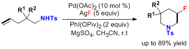刘国生和吴涛等研究人员首次发现在钯的催化下,利用AgF作为氟源,PhI(OPiv)2为氧化剂,可以实现烯烃的分子内的氟胺化反应。该反应以很好的化学选择性和区域选择性得到含氟的六元含氮杂环,这类化合物目前被广泛应用于药物化学的研究中。而且值得注意的是该反应在室温下进行就可以得到80%以上的收率。在进一步的研究中发现,该反应是通过Pd(IV)的中间体,最后主要是通过直接还原消除的方式得到构型保持的C-F键。与其他含氟氮杂环的合成方法相比,该反应具有简单、高效、选择性好等特点。同时,该反应的发现为进一步探讨金属催化剂与氟化试剂的相互作用提供了重要的理论基础。