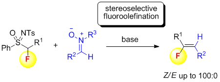 图2. α-氟代亚砜亚胺与硝酮发生反应高度立体选择性生成单氟烯烃。