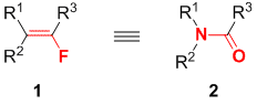 图1. 单氟烯烃1与酰胺2在电荷分布和偶极距方面具有相似性。