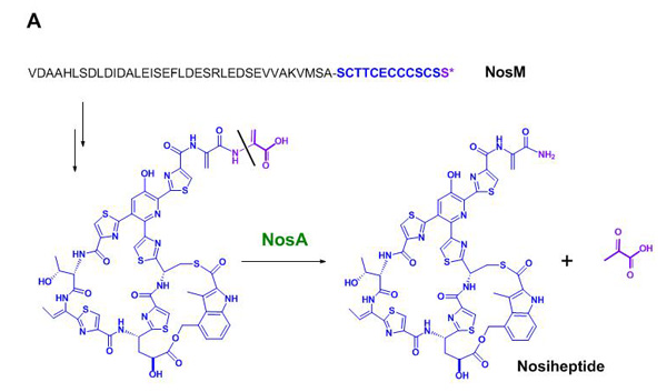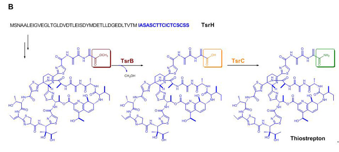 硫肽类抗生素是一类富含元素硫、结构被高度修饰的聚肽类天然产物,所有的成员都具有一个以6元杂环为核心、由多个5元杂环和脱水氨基酸所组成的环肽结构。大多数硫肽类抗生素具有良好的抗菌活性,其中部分成员对多种耐药性的条件致病菌具有极强的杀伤效果。在前期工作中,上海有机所的研究人员揭示了硫肽生源途径的共同特点,即以一条核糖体来源的前体肽为底物、经过保守的翻译后修饰而形成特征性的框架结构(Chem. Biol. 2009, 16, 141; ACS Chem. Biol. 2009, 4, 855; Mol. BioSyst. 2010, 6, 1180)。这一发现引起了广泛的关注和兴趣(亮点评述:SciBX 2009, 2(10), DOI: 10.1038/scibx.2009.423; Angew. Chem. Ind. Ed. 2009, 48, 6770; Nat. Prod. Rep. 2010, 27, 153)。