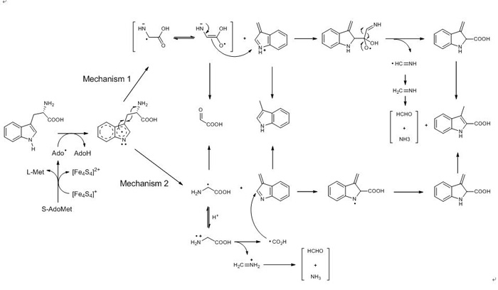 SAM-依赖的自由基蛋白超家族目前包含了数千个成员,参与了动物、植物和微生物体内大量的重要生物化学过程。这些蛋白以SAM为底物、并采用共同的机制产生一种强氧化剂——自由基Ado•,从而起始了高度多样性的反应参与各种生物转化,比如DNA的修复和维生素、辅助因子及抗生素的生物合成。但是,大多数反应的生物化学机理至今尚不清楚,主要原因在于相关酶蛋白的功能和自由基介导的生物转化没有被阐明。3-甲基-2-吲哚酸合成酶NosL的发现,在理解SAM-依赖的自由基蛋白所催化的复杂结构重排反应方面迈出了重要的一步。美国宾夕法尼亚州立大学的生物化学家S. J. Booker教授在同期发表的《自然-化学生物学》杂志上,对该发现的意义进行了专文评述(Nat. Chem. Biol. 2011, 7, 133)。