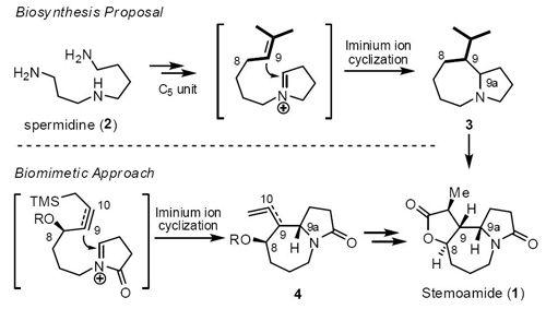 上海有机所天然产物有机合成化学院重点实验室的洪然等科研人员经过三年多的努力,借鉴了生物合成中酶催化的碳阳离子启动的环化反应策略,设计了高效制备四氢喹啉类衍生物的方法 (Org. Lett. 2009, 11, 4036-4039),并巧妙地利用苯鎓离子中间体,发展了新颖的缩环重排反应 (Org. Lett. 2010, 12, 1696-1699)。基于碳阳离子参与的环化反应的可能生物合成机制,发展了简洁高效的百部酰胺 (stemoamide) 仿生合成路线,为该家族中其他复杂生物碱的全合成提供了新的合成思路 (Angew. Chem., Int. Ed. 2011, 50, 2787-2790)。