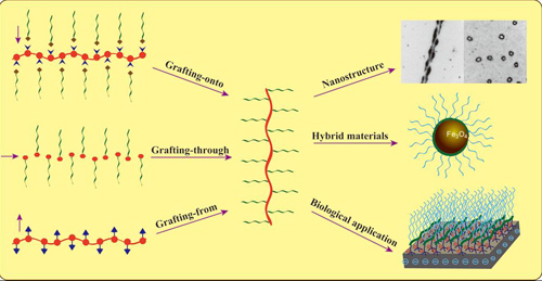 与其它类型的共聚物相比,接枝共聚物的侧链是通过共价键连接到线形主链上,使得高分子侧链被限定于一定区域内,所以接枝聚合物具有高度密集的分子结构。由于接枝共聚物在结构上的差异,使得接枝共聚物表现出很多不同的性质,例如:结构紧凑、显著的链端效应等,能够在溶液中组装成多种稳定的自组装形貌,在制备微纳结构、杂化材料以及生物应用等方面有着重要的用途。