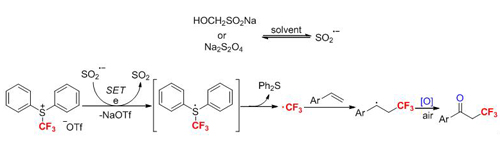 类似地,三氟甲基二苯基锍盐还可以被无机还原剂还原产生三氟甲基自由基(·CF3)。[Ph2SCF3]+[OTf]-被雕白粉和保险粉等还原后产生的·CF3,可以与末端芳基烯烃加成,生成苄基自由基中间体,然后经空气中的氧气氧化,得到羰基三氟甲基化产物 (Chem. Commun., 2011, 47, 6632-6634)。