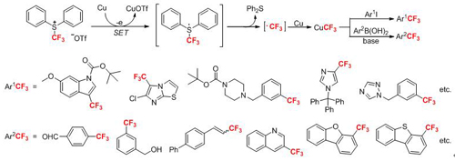 5, 546)。另外,在碱的参与下,由锍盐产生的CuCF3还可以与Ar