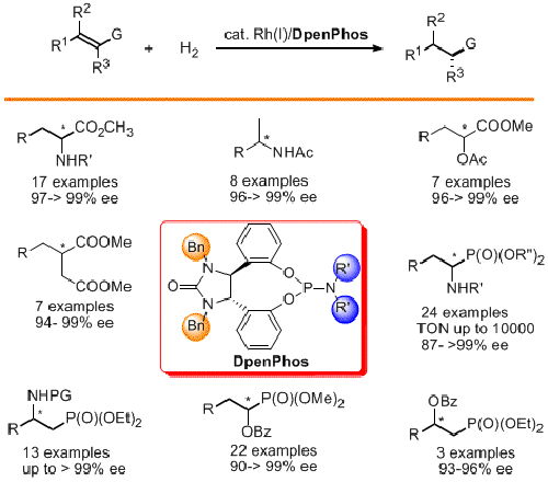中国科学院上海有机化学研究所金属有机化学国家重点实验室的丁奎岭课题组经过数年的努力,设计并发展了一类具有自主知识产权的、容易实现结构多样性的手性单齿亚膦酰胺配体DpenPhos,该类配体与Rh(I)组成的催化剂在α-脱氢氨基酸甲酯和衍生物、N-乙酰芳基烯胺等多种类型烯烃的不对称催化氢化反应中均取得了优秀的效果(J. Am. Chem. Soc. 2005, 127,10488-10499); 进一步研究发现,对于烯醇羧酸酯和β-芳基依康酸酯等较困难烯烃底物的不对称氢化,催化剂中手性配体中氮原子上的氢存在可以显著提高催化活性,对催化剂核磁共振谱以及量化计算研究等表明,这是由于配体间形成了分子间氢键所致,从而揭示了配体与配体之间的弱作用可以作为手性催化剂性能调控的一种新手段(J. Am. Chem. Soc. 2006, 128, 14214-14215)。利用DpenPhos/Rh(I)催化剂中配体的氢键作用,还实现了首例单齿亚磷酰胺/Rh催化的α,β-不饱和氨基膦酸类底物的高效、高对映选择性不对称氢化,相应的氢化产物α-和β-氨基膦酸衍生物是氨基酸生物学意义上的电子等排体和重要的药物合成中间体,氢化产物的光学纯度通常在95%-->99%, 其中包括杀菌药Alafosfalin (99%光学纯度)及胺肽酶抑制剂phospholeleucine (98%光学纯度)等的简便合成,成为此反应性能最优秀的体系之一(Angew. Chem. Int. Ed. 2011, 50, 11743–11747)。利用该催化剂,进一步实现了a-和β-苯甲酰氧基不饱和膦酸酯的不对称氢化,以优秀的对映选择性(90->99% ee),获得相应的氢化产物(Org. Biomol. Chem. 2012, 10, 1598-1601)。该类催化剂有望用于更多类型烯烃衍生物的不对称催化氢化反应中,所揭示的氢键弱作用可以调控反应性能的机理为新一代手性催化剂的设计提供了重要思路。
