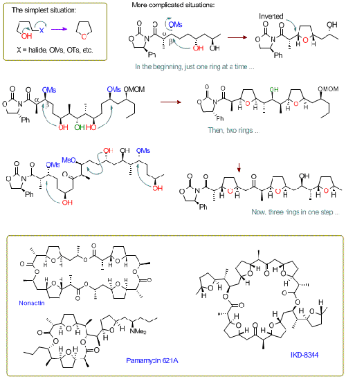四氢呋喃(THF)是最常见的环醚,也是天然产物、特别是离子载体类抗生素的结构中颇为常见的结构单元。合成四氢呋喃(THF)环在大多数情况下都依赖于使用强碱先将游离羟基转化为烷氧负离子,然后进攻离去基团所在的碳原子,经分子内烷基化(醚化)反应来关环(参见下图中the simplest situation)。当被烷化的羟基无空间障碍、烷化离去基团所处的位置也不容易发生b-消除等副反应时,用分子内烷化反应构建四氢呋喃环一般都很容易实现,所以通常视为“常规操作”。然而,当离去基团处于某些特殊位置,如羰基的b-位、而羟基也是具有显著空间障碍时,情况就有可能发生根本性的变化;“平淡无奇”的“常见”反应也会因副反应占主导地位而根本无法实现。