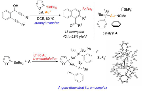 77, 1915 etc.),最近发现2-三丁基锡基呋喃可以作为一类优秀的金属转移试剂,从而实现金催化的1,6-二炔-4-烯-3-醇环化/金属转移反应,高效地合成了2-三丁基锡基萘酮类产物。研究结果表明反应经历了由Sn到Au和由Au到Sn的金属转移反应过程。通过呋喃锡与阳离子型金络合物的当量实验分离得到的二金物种直接证明了金属转移反应的发生,同时也揭示了金催化的反应体系中可能广泛存在此类二金中间体。该反应无需其它金属协同催化,仅在单一金催化剂的作用下就可以很好地实现金属转移反应。该工作不仅拓展了金催化的反应模式,对于金催化的其它金属转移反应的研究也具有一定的启示作用(