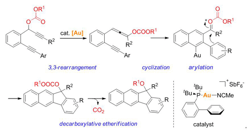 在此研究结果基础上,该课题组设计并开展了金催化的炔丙醇碳酸酯的多步串联反应。和已经被广泛研究的炔丙醇羧酸酯如醋酸酯的重排反应相比,由于碳酸酯吸电子能力的降低,使得经历3,3-重排反应后的联烯中间体中β碳原子亲核性增强,后续反应所生成的氧嗡离子中间体由于同样的原因稳定性也有所增强。利用这一基本思想,该课题组研究人员成功地实现了金催化的1,6-二炔-4-烯-3-碳酸酯的3,3-重排反应/环化反应/亲核加成反应/脱羧醚化的串联反应,高效地合成了苯并[b]芴类衍生物(Angew. Chem. Int. Ed. 2012,51, 6493)。该反应具有反应条件温和、底物适用性广等优点。其中,金催化的脱羧醚化反应属于首次报道。该串联反应也为研究新型金催化的炔丙醇酯的重排反应提供了新的研究思路。