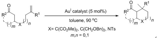 上海有机所沪港化学合成联合实验室支志明院士课题组通过调控金络合物催化剂的配体和抗阴离子,首次实现了Au(I)催化的分子内单羰基a位亚甲基与非活化单取代烯烃及1,1-二取代烯烃的直接烷氢化反应 (Angew. Chem. Int. Ed. 2011,50, 4937)。反应不需要任何的添加剂,通过exo-trig环化方式进行,可高效构建五元,六元,并环以及螺环类化合物,对多种官能团均可很好的兼容,并能放大到克量级进行反应。该方法不仅大大拓宽了金催化C-C键生成反应的适用范围,也为设计新的金催化的反应打开了思路。