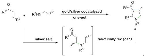 该课题组进一步利用金属共催化的概念,实现了金(I)/银共同催化的N-Michael加成/单羰基α位亚甲基与非活化烯烃分子内烷氢化串联反应。反应通过简单的原料出发“一锅法”简便的合成了具有潜在生理活性的四氢吡咯类化合物。其中AgClO4催化了第一步N-Michael反应,生成的中间产物在金(I)/银催化剂组合的作用下发生第二步的分子内单羰基α位亚甲基对非活化烯烃烷氢化反应。该工作以约稿的形式发表在贝尔斯坦有机化学金催化特刊上(Beilstein J. Org. Chem. 2011, 7, 1100)。
