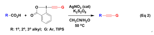 利用二价银离子的氧化脱羧特性,课题组进而发展了脂肪酸的自由基脱羧炔基化反应(J. Am. Chem. Soc. 2012, 134, 14330–14333.)。如Eq 2所示,以硝酸银为催化剂,过硫酸钾为氧化剂,脂肪酸与炔基高价碘试剂反应,即得脱羧炔基化产物。该反应在水相中进行,条件温和,底物适用范围广,同时具有良好的官能团兼容性,很好地体现了自由基反应的优越性。而且反应产生的副产物为邻碘苯甲酸,是合成高价碘试剂的原料,理论上可以回收利用。