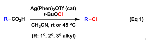 中国科学院天然产物有机合成化学重点实验室李超忠课题组对Hunsdiecker反应开展了三年多的研究,发现以一价银与1,10-啡咯啉形成的络合物Ag(Phen)2OTf为催化剂,脂肪酸在温和条件下与次氯酸叔丁酯作用,即可高效地脱羧氯代(J. Am. Chem. Soc. 2012, 134, 4258–4263.)。这是首例过渡金属催化的脂肪酸Hunsdiecker反应(Eq 1)。该方法不仅具有很好的普适性和官能团兼容性,而且具有良好的化学选择性,羧酸的反应性按如下次序递增:芳基 << 1o烷基 < 2o烷基 < 3o烷基 ≈ 苄基。通过机理研究,认为该反应是二价银介导的自由基过程。