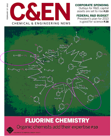 近来,2012年2月27日出版的C&E News再次以封面文章的形式介绍了全球有机氟化学研究进展(见下图)。该封面文章再次关注了中国科学院上海有机化学研究所有机氟化学院重点实验室,认为“该实验室在氟化学研究方面具有较长的历史……目前拥有10个研究小组”。文章还特别介绍了该重点实验室卿凤翎课题组和沈其龙课题组最近在三氟甲基化和三氟甲硫基化方面的创新成果。值得指出的是,该期C&E News杂志封面列出了最近由世界各国化学家开发并且受到全球医药农药界关注的9个金属参与的氟化学反应,其中的3个反应(包括铜参与的三氟甲基化反应和三氟甲硫基化反应等)是由中科院上海有机化学研究所有机氟化学院重点实验室原创开发的(见下图圈出部分)。