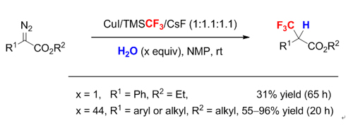 该课题组在探索三氟甲基化反应的新成键模式过程中,首次研究了三氟甲基铜(由碘化亚铜与亲核三氟甲基化试剂TMSCF3在氟化铯作用下制得)与重氮化合物通过氟烷基铜卡宾中间体进行的氟烷基迁移插入反应,找到了一种合成α–三氟甲基羧酸酯的普适性新方法。他们发现,向体系中添加适当量的水,不但不会明显影响三氟甲基铜的稳定性,而且还可以大大促进三氟甲基化反应的顺利进行。初步机理研究表明,水的存在可以消除碘离子对三氟甲基铜反应活性的抑制作用,从而有利于三氟甲基铜与重氮化合物的作用,继而发生三氟甲基的转移。论文在《美国化学会会刊》发表后(J. Am. Chem. Soc. 2012, 134, 15257),成为该期刊网络版2012年10月份被下载次数最高的十篇文章之一,并且被Synfacts收录(Synfacts 2012, 8, 1361)。