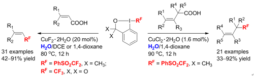 该课题组还在水/有机溶剂反应体系中,采用二价铜盐作为路易斯酸催化剂,利用他们自己开发的亲电二氟甲基化试剂以及商品化的亲电三氟甲基化试剂(Togni试剂),首次实现了对α,β-不饱和羧酸的脱羧二氟甲基化和三氟甲基化反应(Angew. Chem. Int. Ed. 2012, 51, 3944;Synfacts介绍此工作:Synfacts 2012, 8, 750)。随后,他们发现该氟烷基化脱羧反应还适用于β,γ-不饱和羧酸类底物(Angew. Chem. Int. Ed. 2012, 51, 11545)。在该研究中,他们发现水的存在对于反应的顺利进行至关重要。对照实验表明,在无水条件下的反应产率显著低于在水/有机溶剂混合体系中的产率。该方法的亮点是不但反应的区域和立体选择性很高,而且由于反应对水和氧气不敏感,操作简单易行。该方法在其它不饱和羧酸体系中的拓展研究正在进行之中。