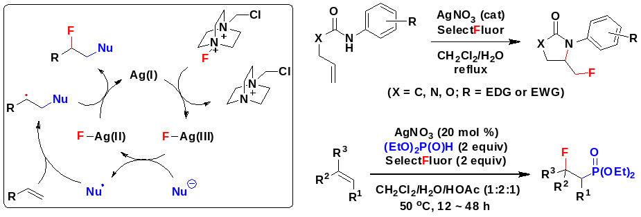 中科院上海有机化学研究所天然产物合成化学院重点实验室李超忠课题组在研究催化型的Hunsdiecker反应过程中发现,以硝酸银为催化剂,商品化的试剂Selectfluor(全称为:1-Chloromethyl-4-fluorodiazoniabicyclo[2,2,2]octane bis(tetrafluoroborate))为氟源,脂肪酸在室温至65 oC温度下即可在水相中脱羧氟代,以较高的效率生成相应的氟代烷烃(J. Am. Chem. Soc. 2012, 134, 10401–10404.)。课题组由此首次提出了“金属参与的氟原子转移自由基反应”这一概念以及相应的三价银介导的新颖反应机理。