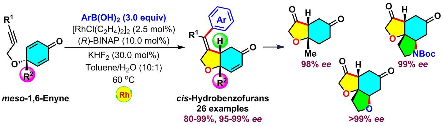 手性的顺式氢化苯并呋喃骨架广泛存在于天然产物中,对环己二烯酮催化的不对称去对称化反应是构建这个骨架最直接和高效的方法之一。目前主要通过有机催化的分子内的Stetter反应和分子内的Rauhut-Currier反应来实现,但均具有较大的底物局限性。