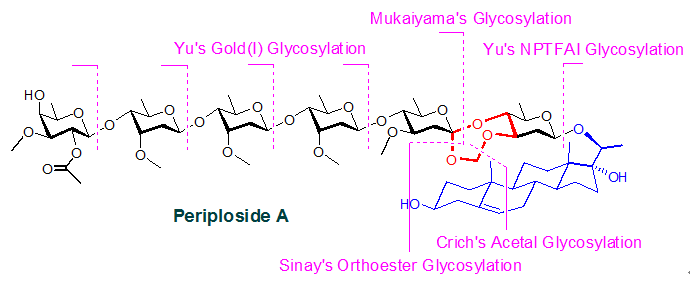 杠柳(Periploca sepium Bge.)的干燥根皮又名北五加皮或香加皮等,是祛风湿、强筋骨的传统中药。1987年,日本化学家首次从杠柳中分离鉴定了一类结构独特的孕甾糖苷化合物--杠柳苷(periploside)。随后的体内外实验发现杠柳苷具有显著的免疫抑制活性,佐证了该中药用于治疗类风湿症的功效。而杠柳苷的确切结构直到2011年才由中科院上海药物所的赵维民等通过X-射线单晶衍射得到确定,证明该类化合物具有一个独特的亚甲基缩醛桥连的七元环原酸酯结构。