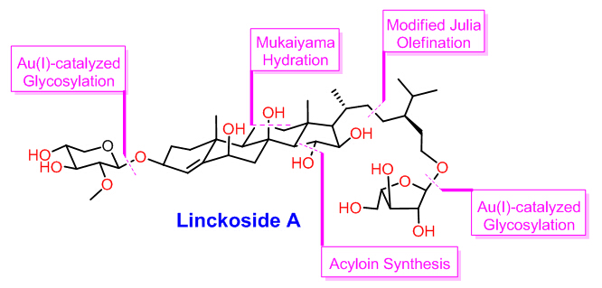 Linckoside A和B是日本名古屋大学Ojika教授小组从冲绳海域蓝海星(Linckialaevigata)中分离得到的一系列多羟基海星皂甙中的主要成份。生物活性测试表明,它们具有促神经生长活性,并对神经生长因子促进的PC-12细胞的分化有显著的协同效应。对于这类天然产物的合成挑战包括:甾核上多羟基(特别是8β-羟基)的引入、手性边链的引入和糖基的引入。俞飚课题组在经历大量尝试后,从工业可得的薯蓣皂甙元出发,使用Davis氧化剂和导向还原实现了15α,16β-反式双羟基的构建,利用环氧水解和Mukaiyama水合反应分别构建了6β-OH和8β-OH。随后,在Julia烯化条件下连接上边链,并使用该课题组发展的一价金催化的糖苷化方法高收率和高立体选择性地实现了C29-OH和C3-OH的糖片段连接。最终,以总步骤44步、线性最长32步和0.5%的总收率成功实现了对Linckoside A和B的全合成。