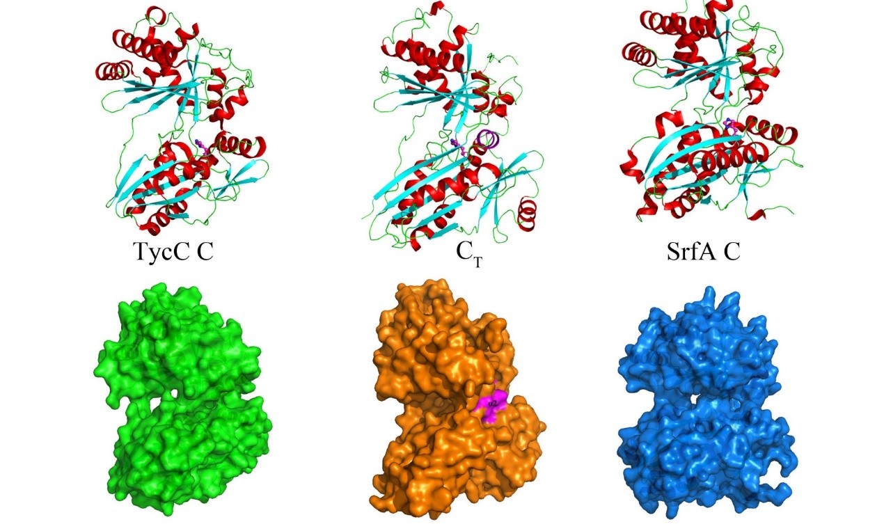 T-CT复合物晶体结构揭示一旦T功能域被活化后,磷酸泛酰巯基将参与稳定T与CT的相互作用,并从CT功能域活性口袋的一侧接纳线状多肽产物,完成最终环状多肽产物的合成与释放。这不仅解释了真菌NRPS中CT功能域为何必须依赖T功能域才发挥作用,也为通过合理设计来产生不同大小与结构的新型大环多肽天然产物提供了技术蓝图。