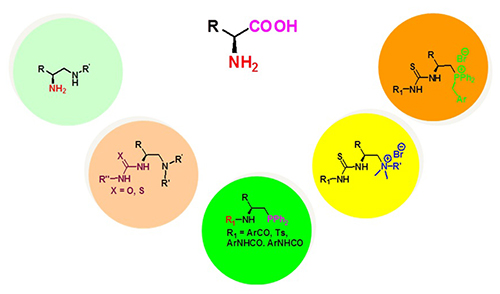 从酶最基本的结构单元氨基酸出发,经过简单化学转化发展出具有酶催化剂的优点同时克服其缺点的结构多样的有机小分子催化剂库,从而实现“源于自然,优于自然”人工酶催化剂的目标。在此研究思路基础上,中科院天然产物合成化学重点实验室赵刚课题组基于廉价、易得的天然手性源(如氨基酸、生物碱),设计、合成了一系列新型手性伯胺-仲胺、伯胺-叔胺、伯胺-膦、叔胺-硫脲、含氢键相转移催化剂等有机小分子催化剂。它们能够高效、高对映选择性催化碳-碳键、碳-氧键以及碳-氟键形成等反应,催化多组分串联反应一步形成多个手性中心并且反应具有较广的底物普适性,其中一些反应方法学已应用于复杂天然产物的合成及手性药物及其中间体的合成,具有较好的应用前景。