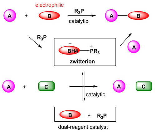 亲核性膦催化方法广泛地应用于不对称有机反应,但同时存在亲核性膦催化剂的催化当量较高、反应类型较窄等问题。基于氨基酸设计、合成手性有机膦与丙烯酸酯组成的一类双试剂的手性离子对,并将其作为手性Brønste酸或Lewis 碱应用于不对称催化Mannich(Angew. Chem. Int. Ed. 2015,54, 1775)和 Strecker (Nature Communications, 2016, 7, 12720)等类型反应中,取得优异的产率、对映选择性,该类反应具有低催化当量以及反应时间短的特点。初步揭示的反应机理,可以观察到手性非线性效应在同一反应中随底物不同而变化。