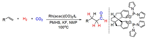 迄今为止,这是首例以CO2作为CO替代品对烯烃氢甲酰化反应并分离得到醛类产物的报道, 展示了CO2作为C1资源进行有效化学利用的一条新路径。这部分成果作为Hot Paper发表在《德国应用化学》(Angew.Chem. 2017, 129, 316-319)。